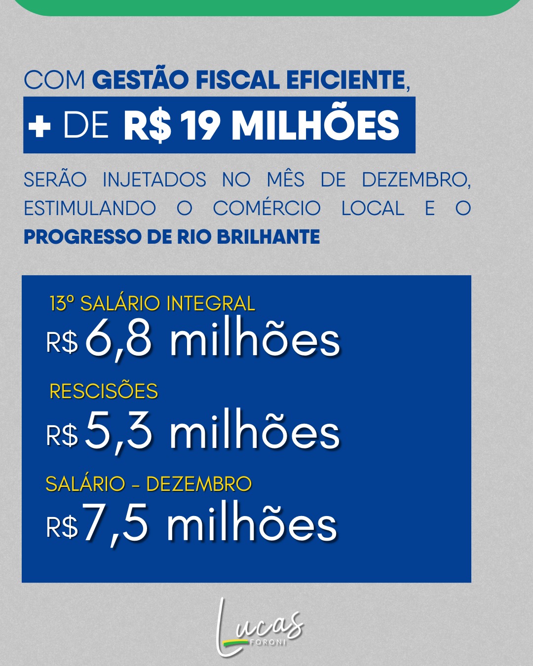 A administração do prefeito Lucas Foroni garantiu a injeção de mais de R$ 19 milhões na economia de Rio Brilhante durante o mês de dezembro, impulsionando o comércio local em um dos períodos mais importantes do ano. O valor engloba pagamentos da folha municipal, abono salarial, décimo terceiro e outros repasses que movimentaram diretamente lojas, prestadores de serviços e pequenos empreendedores da cidade.