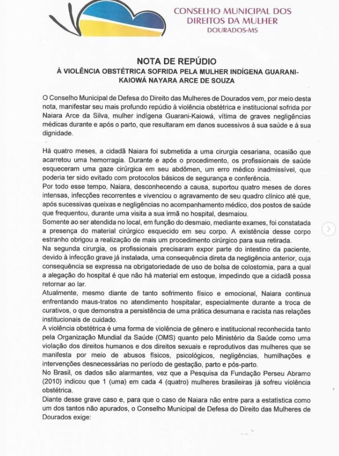 “O Conselho manifesta seu mais profundo repúdio à violência obstétrica e institucional sofrida por Nayara Arce, mulher indígena Guarani-Kaiowá, vítima de graves negligências médicas durante e após o parto”, declarou Gilvane.