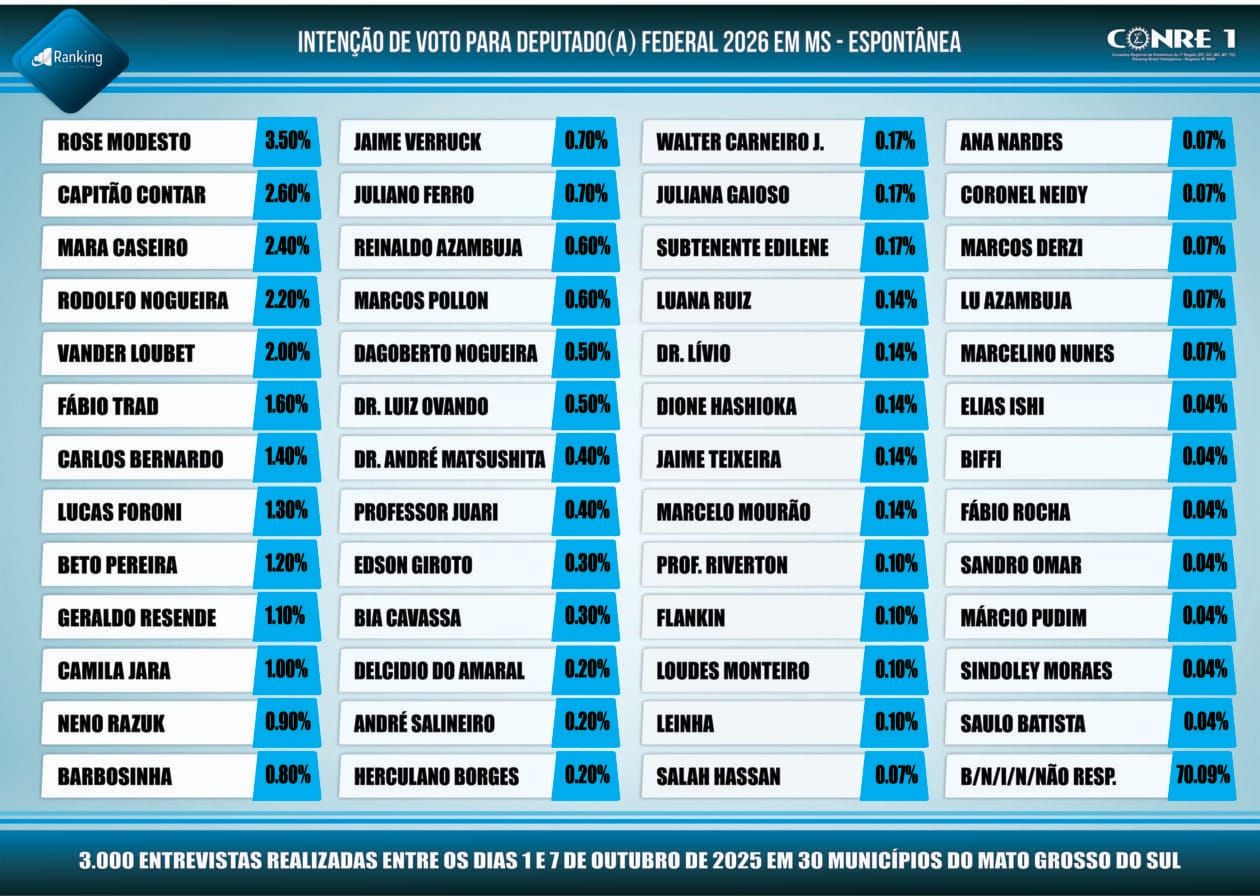 Por encomenda da Rede de Rádios Top FM, a segunda pesquisa realizada pelo Instituto Ranking Brasil Inteligência, de 1º a 7 de outubro deste ano, junto a 3 mil moradores com 16 anos ou mais de idade, em 30 municípios de Mato Grosso do Sul, com intervalo de confiança de 95% e margem de erro de 1,8 ponto percentual para mais ou para menos, traz as intenções de votos para as oito vagas de deputados federais do Estado.